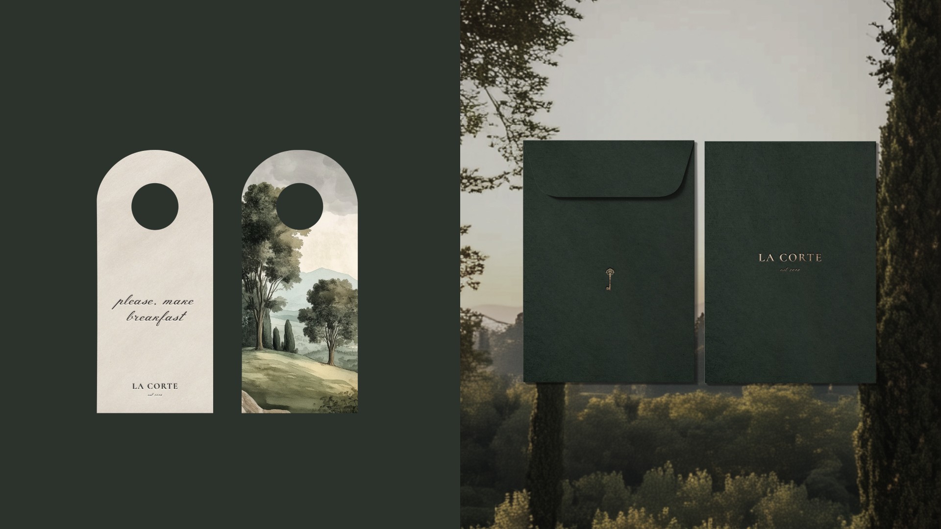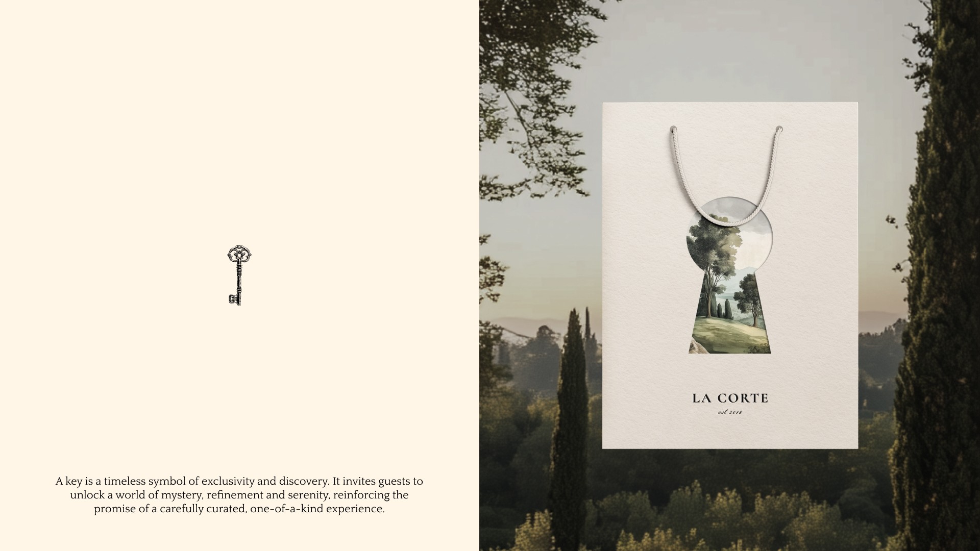 The design solution is built around the concepts of discovery and mystery. Every visual element is crafted to evoke the feeling of unlocking a private sanctuary — quiet, intimate, and carefully curated. The identity speaks to discerning travellers who value authenticity, the art of slow living, and thoughtful hospitality. A nature-led palette of deep greens, soft neutrals, and muted golds grounds the brand in its Tuscan surroundings, conveying harmony, serenity, and quiet confidence.